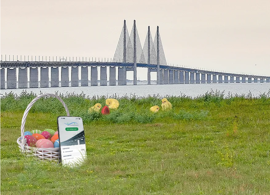 Øresundsbrons nye app med en bil i baggrunden og sommervejr
