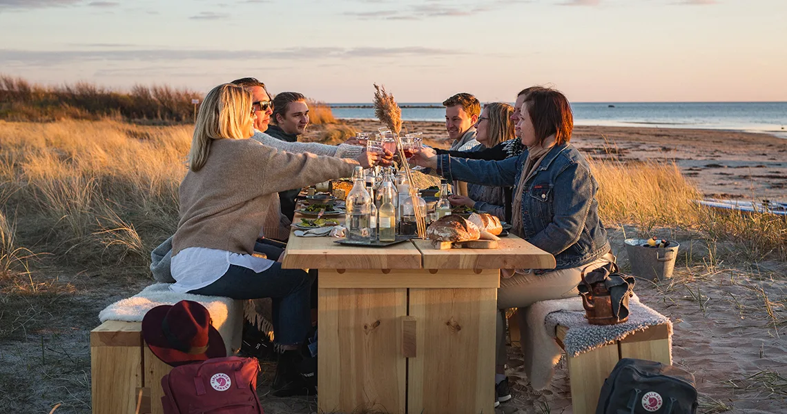 Langs den hallandske kyst venter en unik madoplevelse. Her kan du booke bord på en smuk strand, midt i klitterne blandt siv og den salte vind. Tilkøb en madkurv, egen kok eller bliv guidet og pluk det spislige som gror i området.