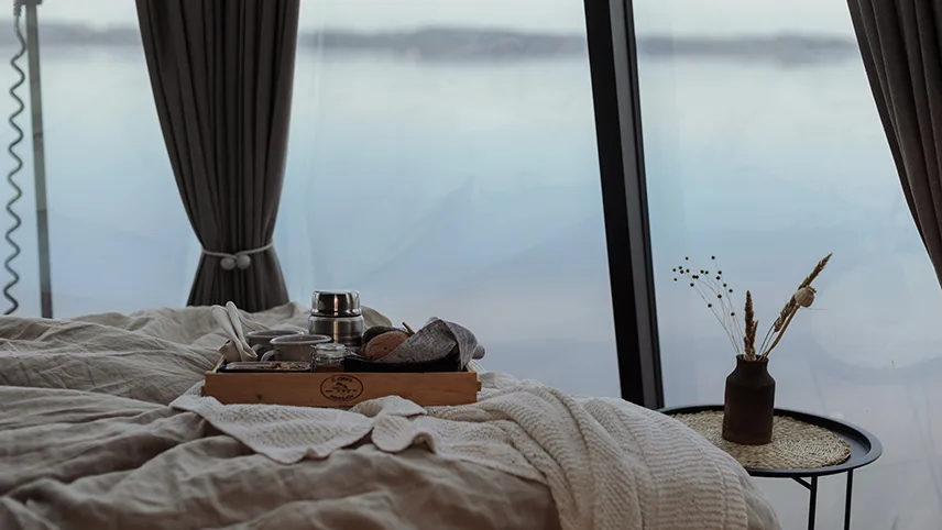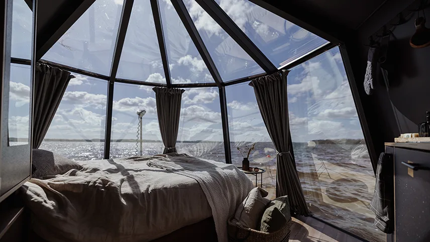 Bo midt i naturen ved Ringsjön hos unikke Yggdrasil Igloo. Her får du en unik mulighed for at koble af i en luksuriøs flydende iglo til to personer.