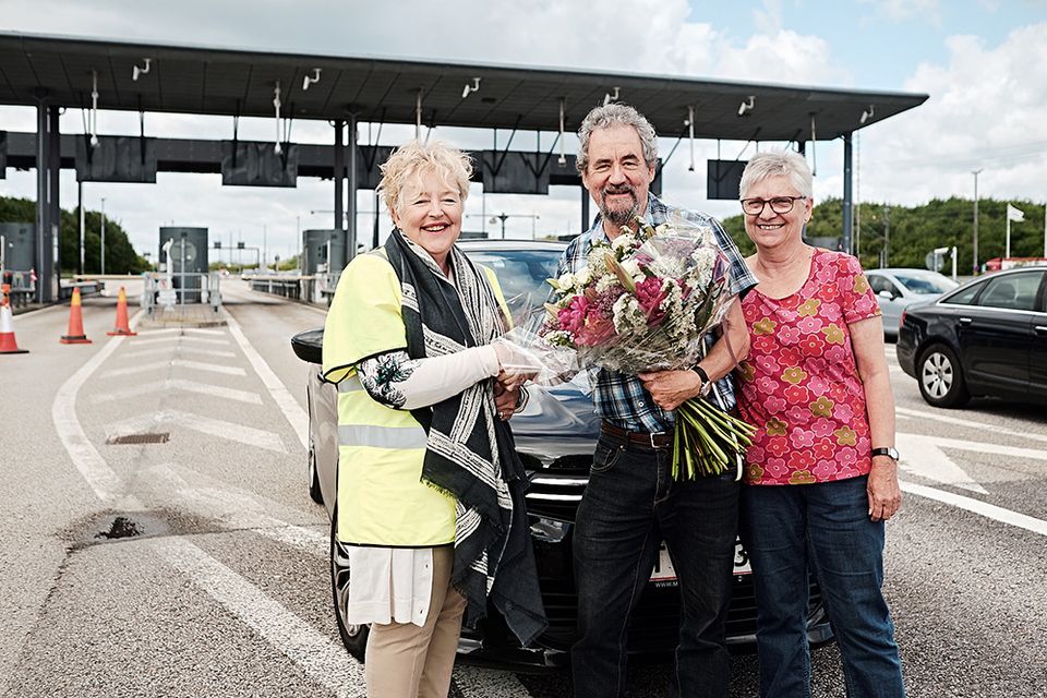 Foto: Bil nummer 100 millioner blev kørt af Jette Bøndergaard og Rolf Andreasen, som var på vej til deres hus i Broby i Sverige. De fik overrakt blomster og et gavekort til et hotelophold i Malmø af Caroline Ullman-Hammer, administrerende direktør ved Øresundsbro Konsortiet.