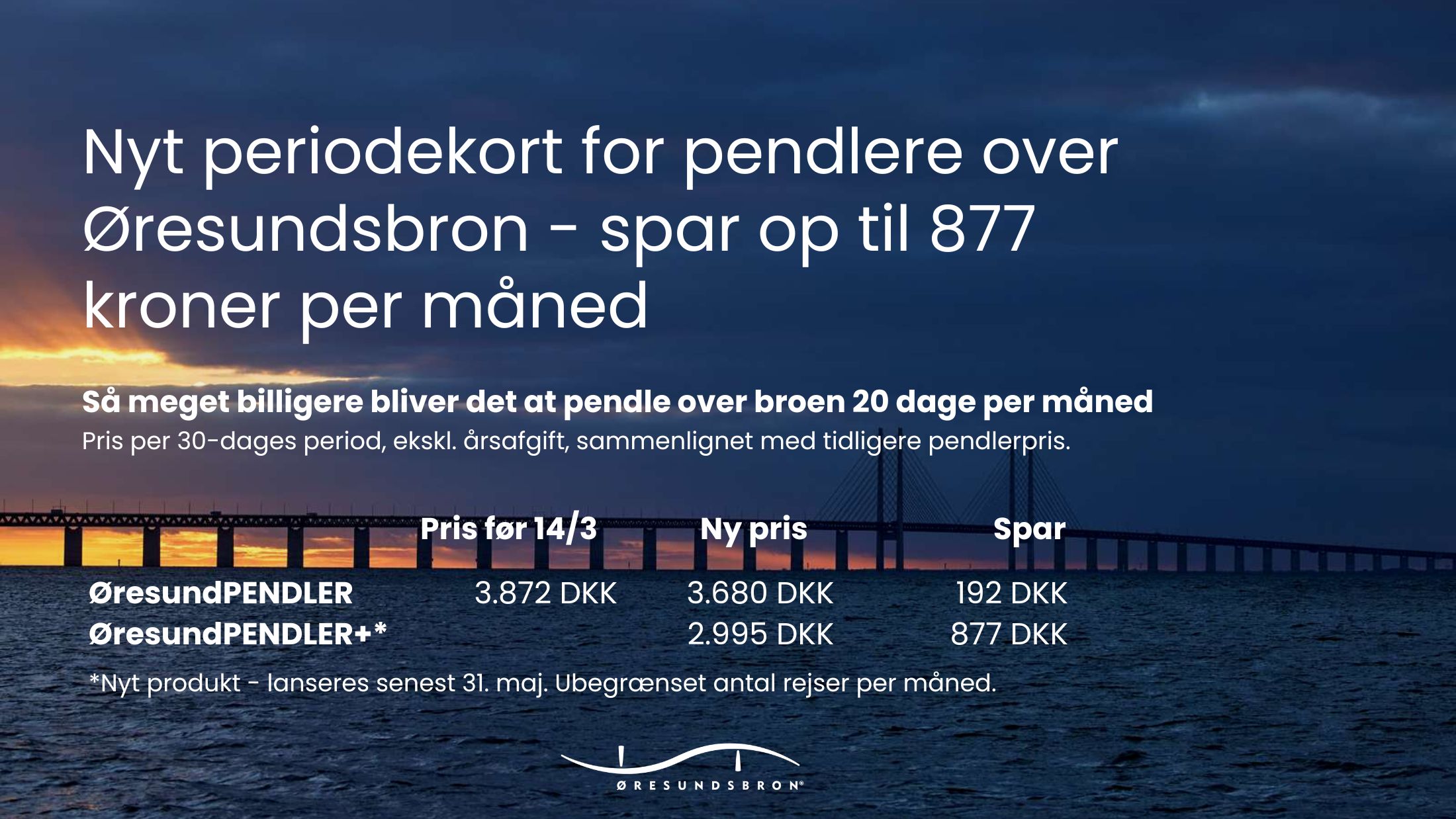 Senest den 31. maj lancerer Øresundsbron rabataftalen ØresundPENDLER+, et periodekort som tilbyder, at pendlerne kan krydse broen så meget de vil til en fast pris i en 30 dages periode. Det betyder, at en pendler, som kører over Øresundsbron 5 dage om ugen, vil kunne spare mindst 877 DKK om måneden med ØresundPENDLER+ frem for den tidligere pendlerpris.