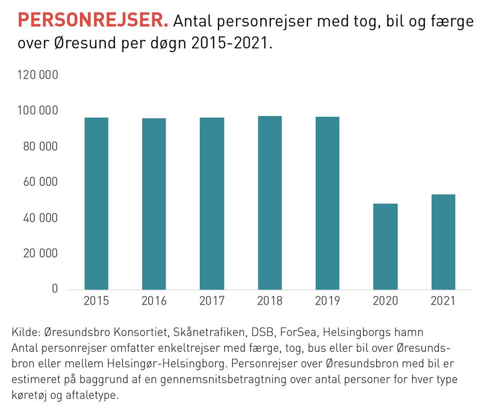 Personrejserne over sundet mindskedes fra 97.000 til 53.000 pr. døgn i årene 2015-2021.