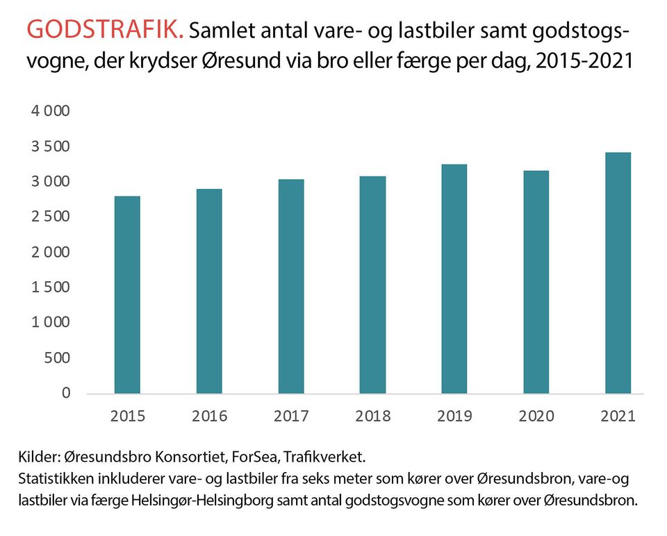 - Godstrafikken gik mod strømmen og steg i løbet af 2021 til et højere niveau end 2019. Sidste år var det samlede antal af vare- og lastbiler samt godstogsvogne, som via bro og færge krydsede Øresund, 5 procent højere end 2019.