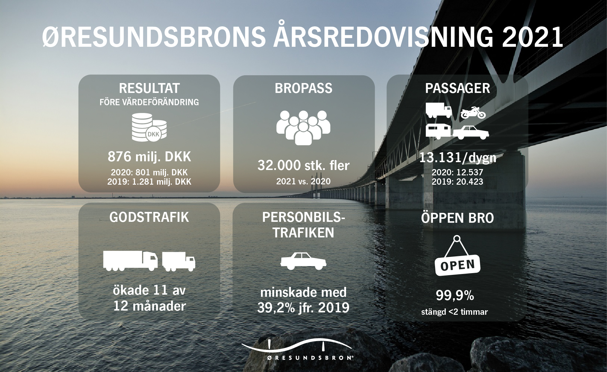 Øresundsbro Konsortiets resultat før værdiregulering blev et overskud på 876 mio. DKK, en stigning på 75 mio. DKK i forhold til 2020, men et fald på 405 mio. DKK i forhold til 2019. Godstrafikken over Øresundsbron nåede rekordhøje niveauer i 2021. Men for fritids-, pendler- og erhvervstrafikken var det endnu et år med reduceret trafik i forhold til 2019.