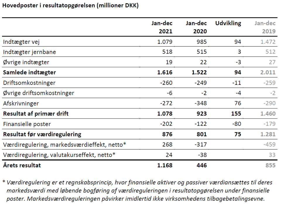 - Vejtrafikindtægterne steg med 94 millioner DKK til 1.079 millioner. Jernbaneindtægter på 518 millioner DKK er indekseret og er derfor ikke påvirket af trafikmængden.