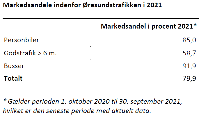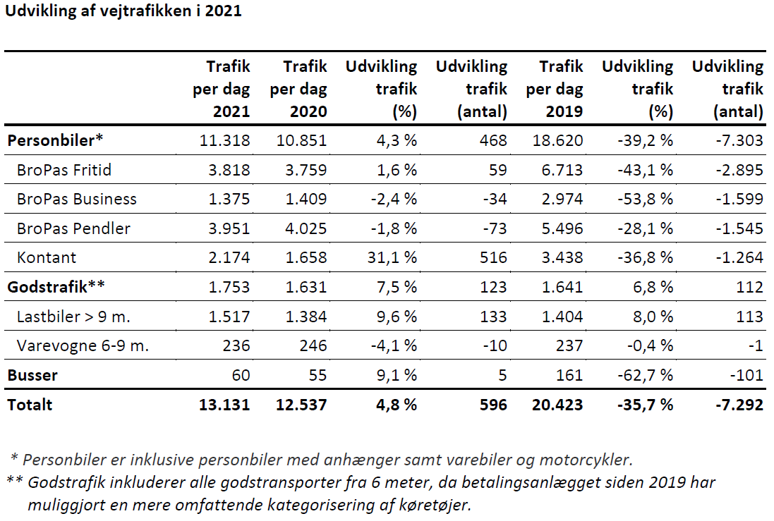 Hver dag passerede i gennemsnit 13.131 køretøjer broen i 2021, hvilket kan sammenlignes med 20.423 i 2019. Til gengæld var det en forbedring på 4,7 procent i forhold til 2020 – et år, der begyndte med normal trafikudvikling i de første 2,5 måneder – takket være fremgangen i godstrafikken.