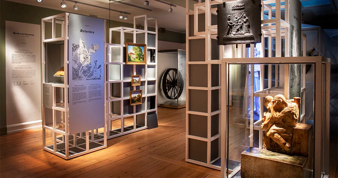 Den fasta utställningen tar dig med på en vandring genom tiden, från de allra första spåren av mänskligt liv i det område som idag utgör Storköpenhamn, till dagens moderna stad, med nedslag på kända platser som Slotsholmen och Strøget. Under resans gång får du lära dig mer om hur man hälsade på varandra under 1700-talet, vem utbrytarkungen Morten Frederiksen var och vad som hände när Nikolaj-kyrkan vid Kongens Nytorv brann år 1795. Missa inte heller den interaktiva modellen som visar Köpenhamns skyline och följer stadens dygnsrytm med ljus.