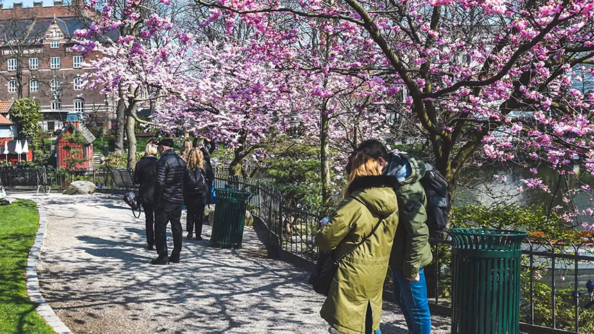 Parken är vackert dekorerad med julgranar, pynt och tusentals glimrande ljus. Doften av hyacinter, glögg och æbleskiver svävar fyller den kyliga luften och överallt hörs munter julmusik, glada skratt och suset från karusellerna.